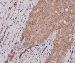 Immunohistochemical analysis of paraffin-embedded human liver carcinoma tissue using E-Cadherin antibody. Counter stained with hematoxylin.