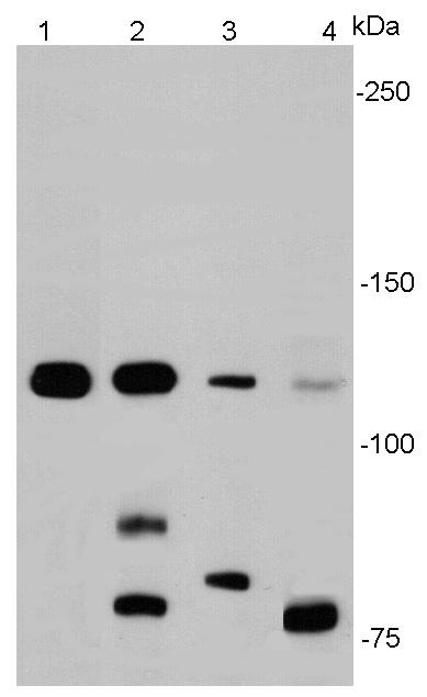 Western blot analysis of E-cadherin on different cell lysates using anti- E-cadherin antibody at 1/1000 dilution. Positive control: