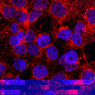 ICC staining GAPDH in HepG2 cells (red). The nuclear counter stain is DAPI (blue). Cells were fixed in paraformaldehyde, permeabilised with 0.25% Triton X100/PBS.
