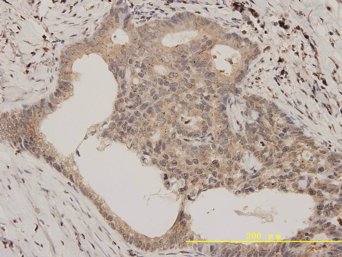 Immunohistochemical analysis of paraffin-embedded human colon carcinoma tissue using Bcl-2 Antibody. Counter stained with hematoxylin.