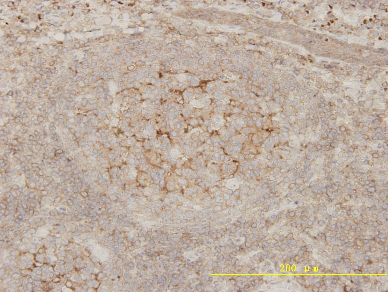 Immunohistochemical analysis of paraffin-embedded human tonsil tissue using Bcl-2 Antibody. Counter stained with hematoxylin.