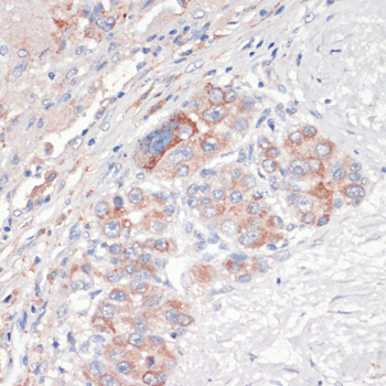 Immunohistochemistry of paraffin-embedded human liver cancer using Bcl-2 Antibody at dilution of 1:200 (40x lens).