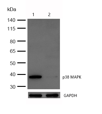 All lanes :p38 MAPK Rabbit mAb at 1/1k dilutionLane 1 : Wild-type A549 cell lysateLane 2 : p38 MAPK knockdown A549 cell lysateLysates/proteins at 20 µg per lane.