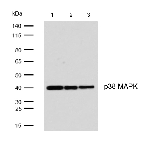 All lanes: p38 MAPK Rabbit mAb at 1/1k dilutionLane 1 : Hela whole cell lysates Lane 2 : 3T3 whole cell lysates Lane 3 : PC12 whole cell lysates Lysates/proteins at 20 µg per lane.SecondaryAll lanes : Goat Anti-Rabbit IgG H&L (HRP) at 1/20000 dilutionPredicted band size: 41 kDa Observed band size: 40 kDaExposure time: 7 seconds