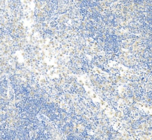 Formalin-fixed, paraffin-embedded rat mesenteric lymph nodes tissue stained for p38 MAPK using 48644 at 1/100 dilution in immunohistochemical analysis.