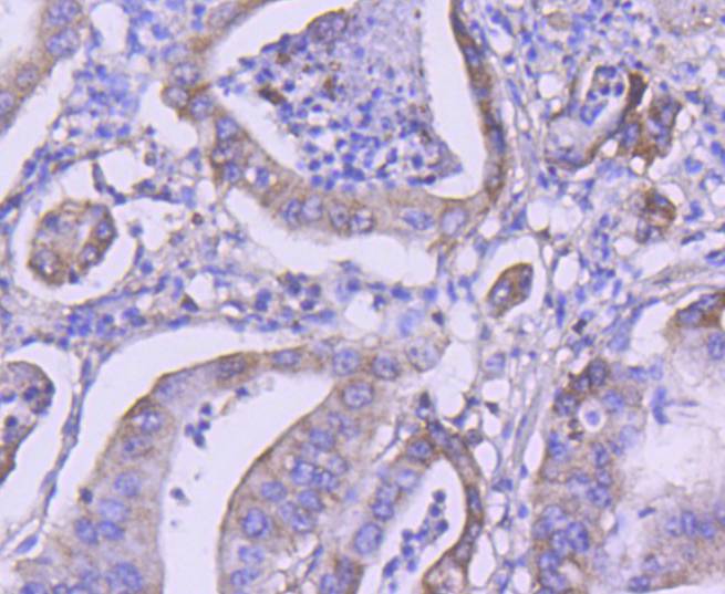 Immunohistochemical analysis of paraffin-embedded human gastric carcinoma tissue using anti-PI 3 Kinase Class 3 antibody. Counter stained with hematoxylin.