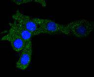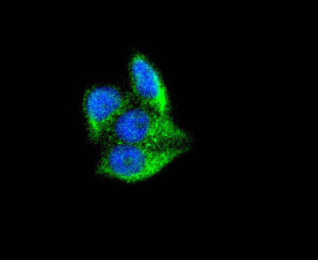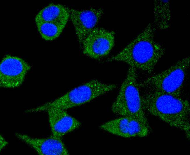 ICC staining Ferritin in MCF-7 cells (green). The nuclear counter stain is DAPI (blue). Cells were fixed in paraformaldehyde, permeabilised with 0.25% Triton X100/PBS.