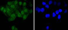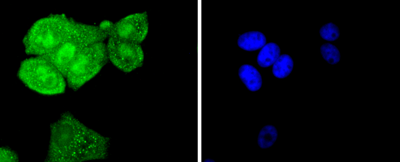 ICC staining SHP2 in MCF-7 cells (green). The nuclear counter stain is DAPI (blue). Cells were fixed in paraformaldehyde, permeabilised with 0.25% Triton X100/PBS.