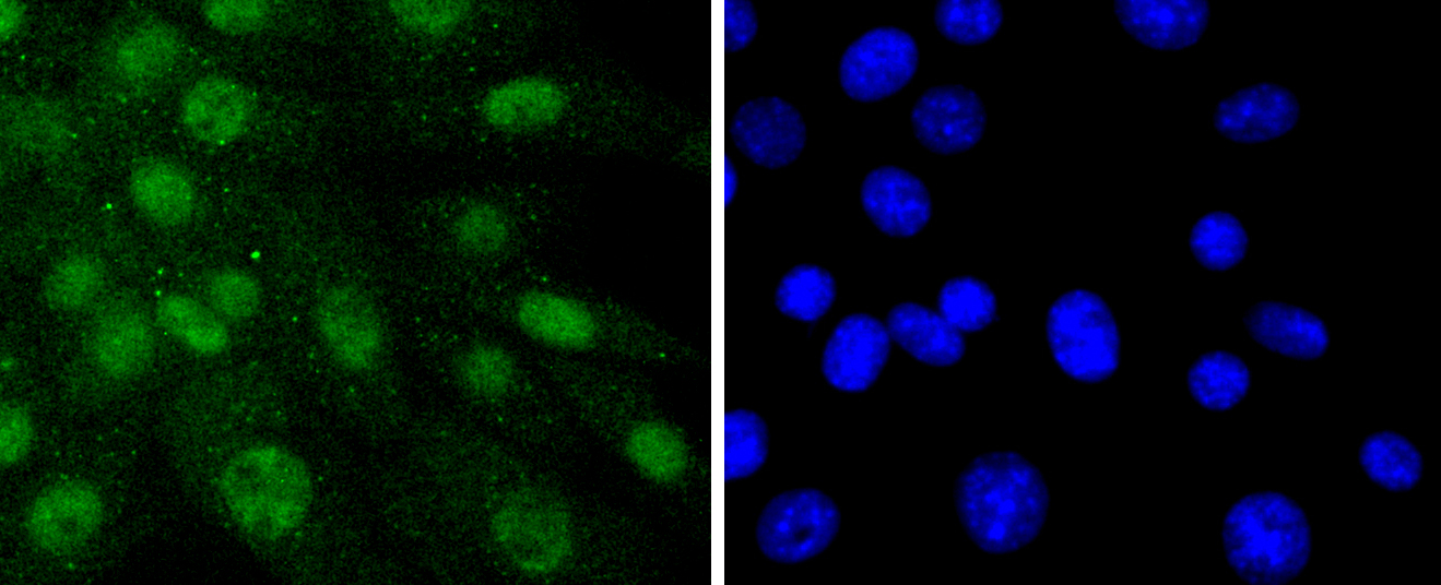 ICC staining SHP2 in NIH/3T3 cells (green). The nuclear counter stain is DAPI (blue). Cells were fixed in paraformaldehyde, permeabilised with 0.25% Triton X100/PBS.