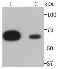 Western blot analysis of SHP2 on different lysates using anti-SHP2 antibody at 1/1,000 dilution. Positive control: Lane 1: Hela Lane 2: 293
