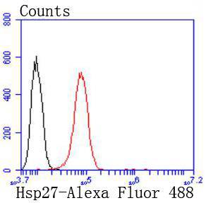 Flow cytometric analysis of Hela cells with Hsp27 antibody at 1/50 dilution (red) compared with an unlabelled control (cells without incubation with primary antibody; black). Alexa Fluor 488-conjugated goat anti rabbit IgG was used as the secondary antibody.