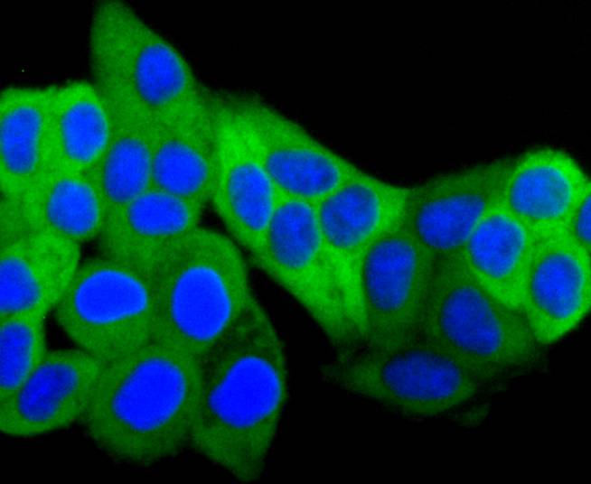 ICC staining Hsp27 in HepG2 cells (green). The nuclear counter stain is DAPI (blue). Cells were fixed in paraformaldehyde, permeabilised with 0.25% Triton X100/PBS.