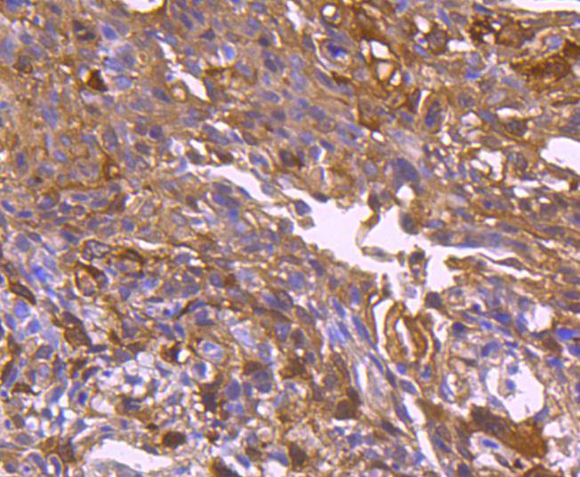 Immunohistochemical analysis of paraffin-embedded human colon cancer tissue using anti-Hsp27 antibody. Counter stained with hematoxylin.