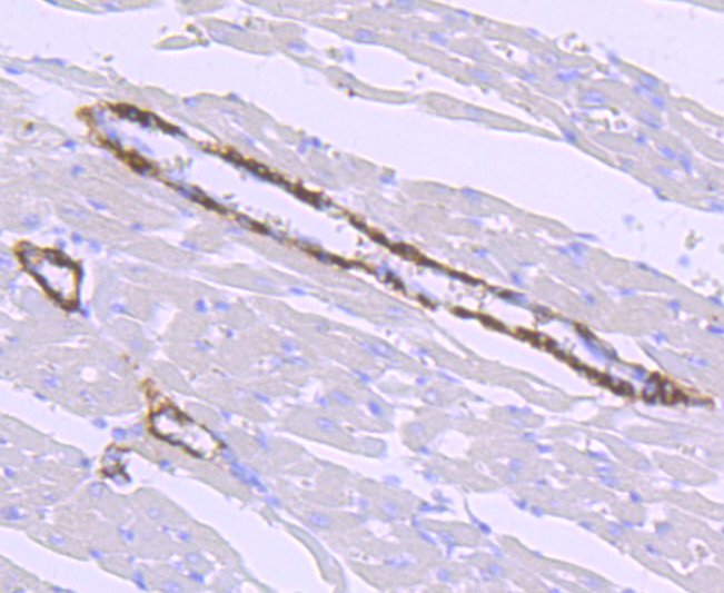 Immunohistochemical analysis of paraffin-embedded rat heart tissue using anti- Hepcidin antibody. Counter stained with hematoxylin.