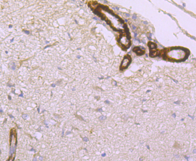 Immunohistochemical analysis of paraffin-embedded rat brain tissue using anti- Hepcidin antibody. Counter stained with hematoxylin.