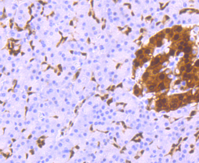Immunohistochemical analysis of paraffin-embedded human pancreas tissue using anti-PDX1 antibody. Counter stained with hematoxylin.