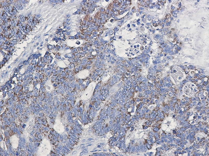 Immunohistochemistry of CD147 in paraffin-embedded Human colon cancer tissue using CD147 Rabbit mAb at dilution 1/50
