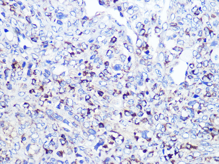 Immunohistochemistry of paraffin-embedded Human oophoroma using CD68 at dilution of 1:100 (40x lens).