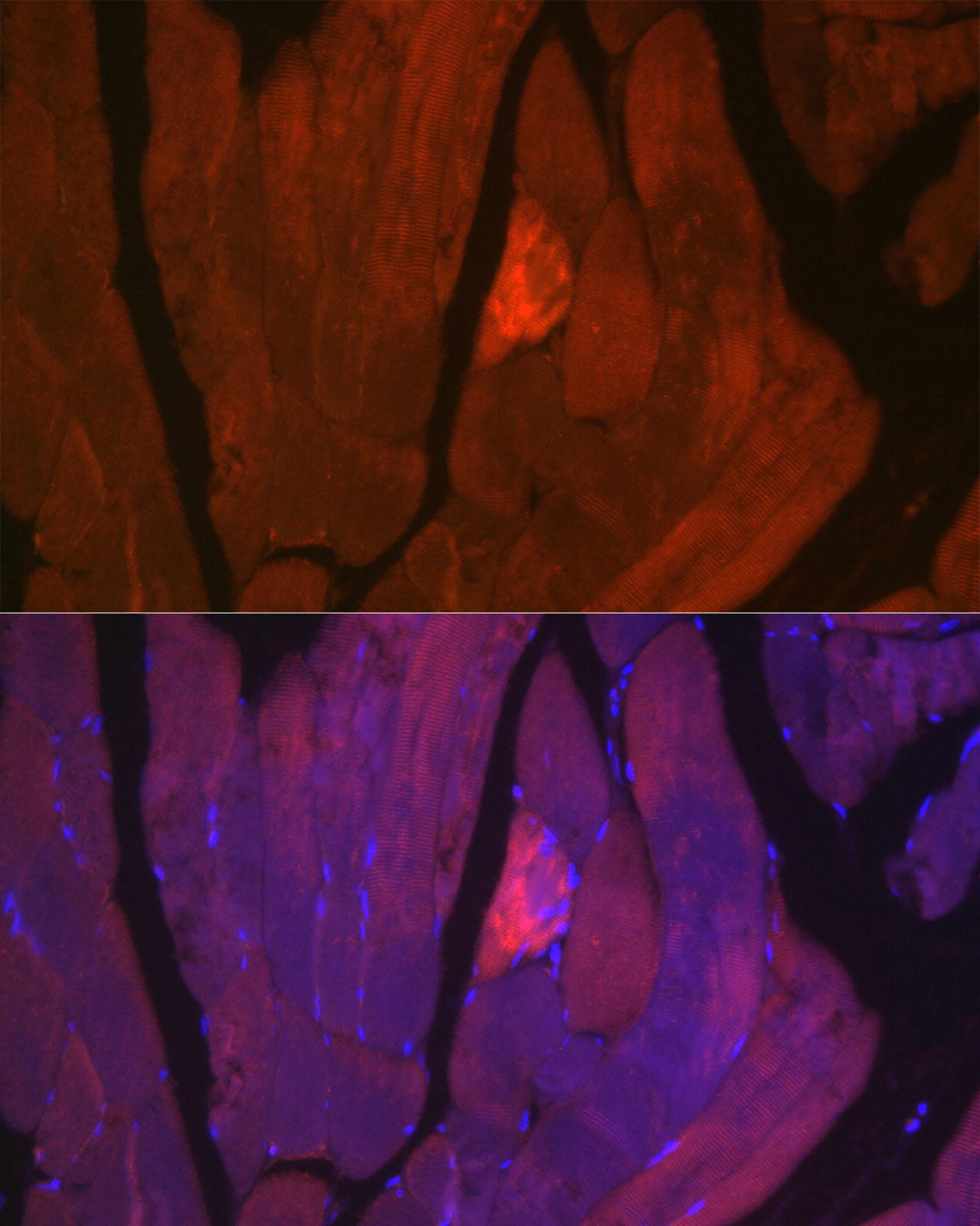 Immunofluorescence analysis of paraffin-embedded rat skeletal muscle using MYH2 at dilution of 1:50 (40x lens).
