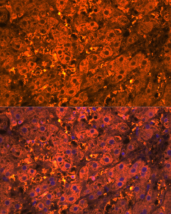 Immunofluorescence analysis of human liver cells using CXCL12 Rabbit pAb.