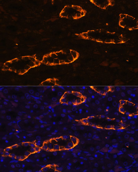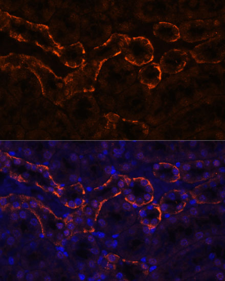 Immunofluorescence analysis of mouse kidney using AQP3 at dilution of 1:100. Blue: DAPI for nuclear staining.