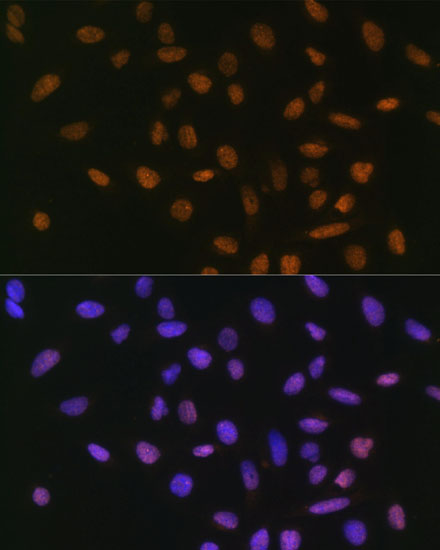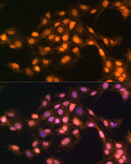 Immunofluorescence analysis of U-2 OS cells using Snail at dilution of 1:100. Blue: DAPI for nuclear staining.