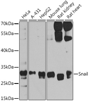 Western blot analysis of extracts of various cell lines, using Snail at 1:1000 dilution.