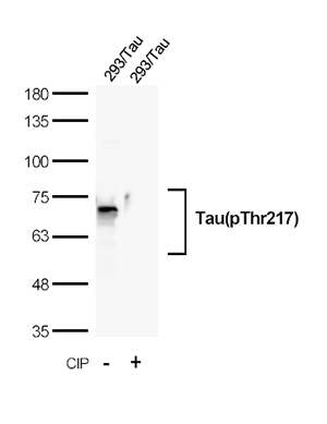 | Western blot analysis of extracts from 293 cells, transfected with Tau and treated with calf intestinal phosphatase (CIP) using Tau(Phospho-Thr181) Rabbit mAb. | Western blot analysis of extracts from 293 cells, transfected with Tau and treated with calf intestinal phosphatase (CIP) using Tau(Phospho-Thr217) Rabbit mAb. |