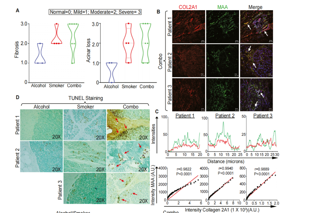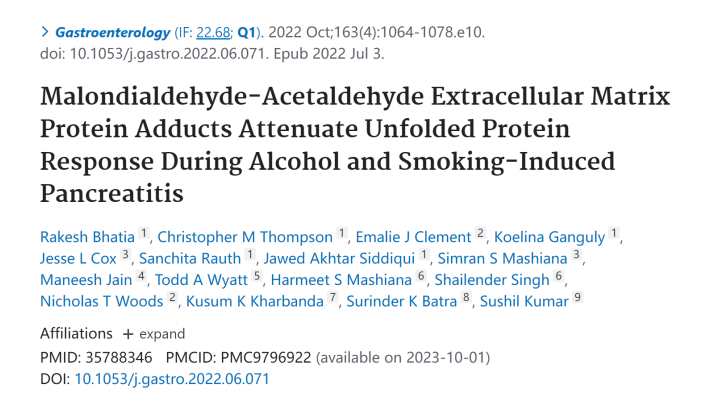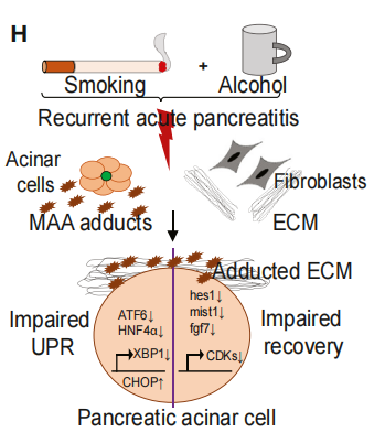 在联合治疗组中,稳定的MAA加合物对胰腺修复和再生有显著的损害。总的来说,酒精和吸烟导致稳定的ECM-MAA加合物的产生,从而降低XBP1的表达,导致内质网应激未解决,并参与受损胰腺实质恢复和再生的蛋白的表达减少,这说明稳定的丙二醛-乙醛细胞外基质加合物在戒烟和吸烟后持续存在。