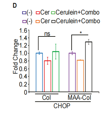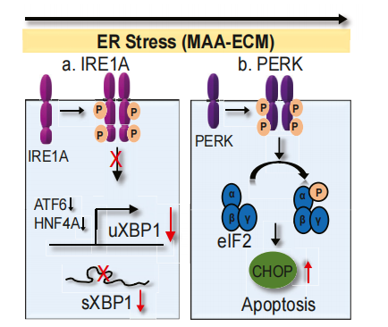 总的来说,MAA-ECM加合物减弱xbp1介导的UPR反应,激活PERK通路和CHOP表达,在酒精和烟雾暴露的情况下导致腺泡细胞死亡(左图)。