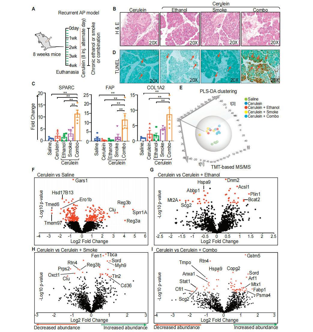 Lieber-DeCarli乙醇喂养和慢性烟雾暴露的RAP模型(图A)。慢性酒精和香烟烟雾暴露(以下联合)动物再现了RAP病理,伴有明显的腺泡辍学、纤维化、ECM沉积(图B)和高炎症反应(图C)。定量逆转录聚合酶链反应分析显示,组合组中ECM标记物如SPARC、FAP和Col1A2的表达显著增加(图C)。末端脱氧核苷酸转移酶介导的脱氧尿苷三磷酸镍末端标记染色进一步证实了联合组的腺泡细胞死亡,特别是在纤维化区域附近的区域(图D)。接下来对来自不同治疗组的小鼠胰腺进行了基于无偏倚串联质谱标记的定量蛋白质组学分析。蛋白质组学主成分分析显示了一个独特的蛋白质组学特征,最常见和最丰富的蛋白质组学改变发生在组合组(56.5%),其次是烟雾暴露(21%)和酒精喂养(17%)小鼠(图1E)。使用log10(P值)与log2(倍数变化)的火山图分析表明,与接触蛙皮缩胆囊肽(图F)、酒精(图G)或烟雾(图H)的动物相比,混合暴露组合(图I)具有独特的蛋白质组特征。