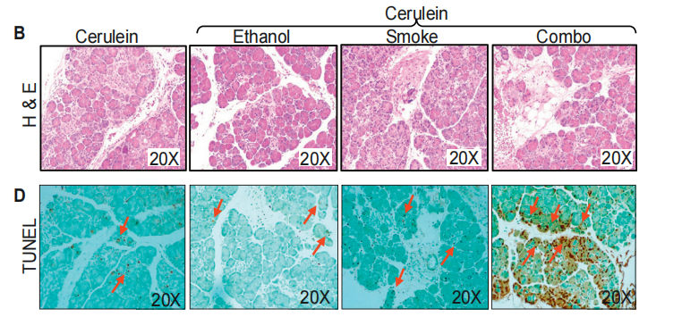 对暴露于酒精、香烟烟雾或酒精和香烟烟雾组合的小鼠的胰腺进行基于串联质谱标签的蛋白质组学和生物信息学分析。对用蛙皮缩胆囊肽与乙醇(50mmol/L)和香烟烟雾提取物(40mg/mL)联合处理的胰腺组织和原代腺泡细胞进行生化、免疫组织化学和转录组分析。