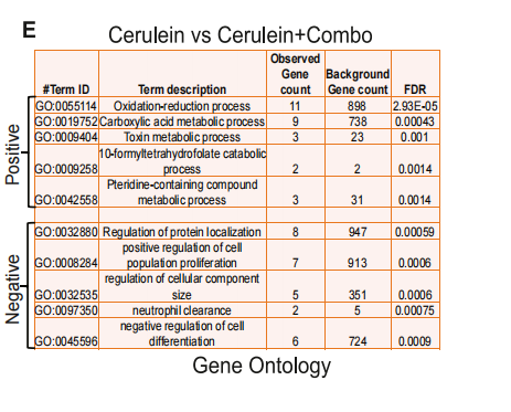 在蛙皮缩胆囊肽处理后,Sord、Arf1、Reg3b和Snx3的转录水平显示出显著的调节。在蛙皮缩胆囊肽处理的动物中,Sord和Arf1等蛋白质的转录本和蛋白质组学分析的差异可能是由于它们在胰腺损伤过程中的蛋白质稳定性。与单独的蛙皮缩胆囊肽相比,组合组中Sord、Arf1和Snx3的表达进一步改变。免疫组织化学和蛋白质印迹分析显示,在不同的治疗组中,腺泡细胞和淋巴血管区域分别有高Arf1和Sord表达,这验证了蛋白质组学分析 (Figure B–D)。图E是对差异表达蛋白质的基因本体论分析,分析表明氧化还原过程、蛋白质定位和毒素代谢过程是组合组中调节的主要途径。
