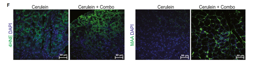 图F为氧化应激标志物、4-HNE、MDA和MAA加合物在胰腺组织中的表达。IF分析显示蛙皮缩胆囊肽和联合组的胰腺中存在4-HNE和MAA加合物。不稳定的醛和MDA加合物产生混合MAA加合物。MAA加加合物主要定位在联合组中明确的胰腺间质部位,表明ECM上存在MAA加成物。这些数据表明,暴露于酒精和吸烟会显著改变胰腺蛋白质组,并产生有毒的醛加合物,包括4-HNE和MAA。
