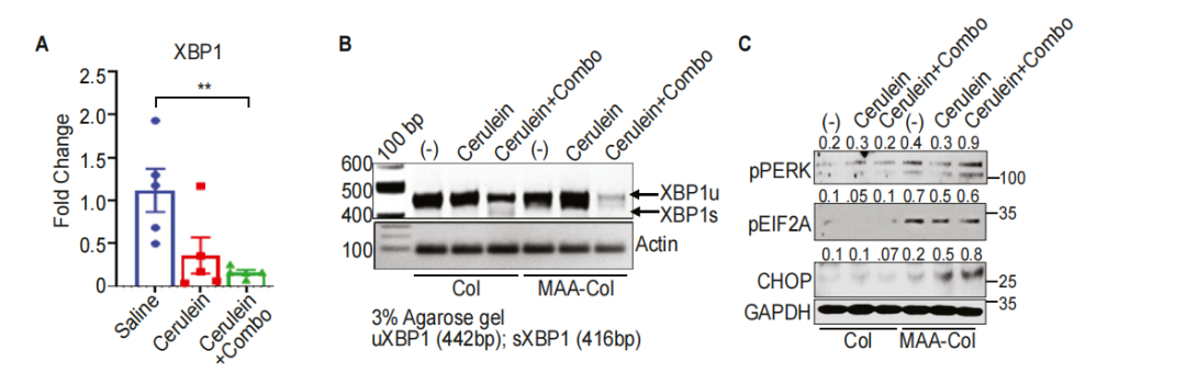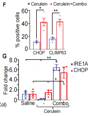 胰腺组织中CHOP和CLIMP63(细胞骨架连接膜蛋白63,内质网应激时扩张的标志)的表达增加,进一步提示联合组中内质网应激和细胞凋亡(图E和F)。此外,蛙皮缩胆囊肽和联合组胰腺组织中IRE- 1a和CHOP的表达增加进一步证实了内质网应激增加的存在(图G)。
