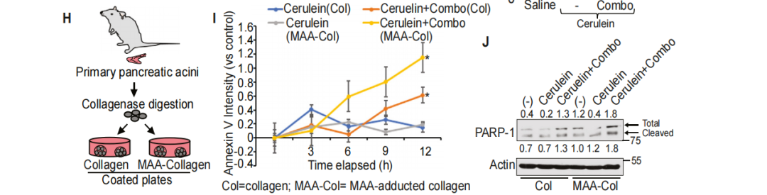 原代腺泡被分离后,培养在胶原涂层和MAA加合物的胶原涂层板上,用乙醇和CSE处理,研究MAA加合物对腺泡细胞活力的影响(图H)。在MAA加合物存在的情况下,联合组的腺泡细胞活力显著下降(图3I),PARP裂解增加(图3J),这表明MAA加合物的ECM单独可以显著作用于腺泡细胞,使其受乙醇和烟雾暴露影响并导致细胞凋亡。