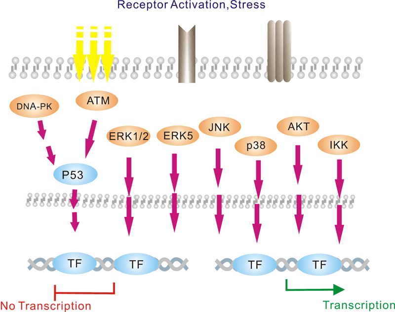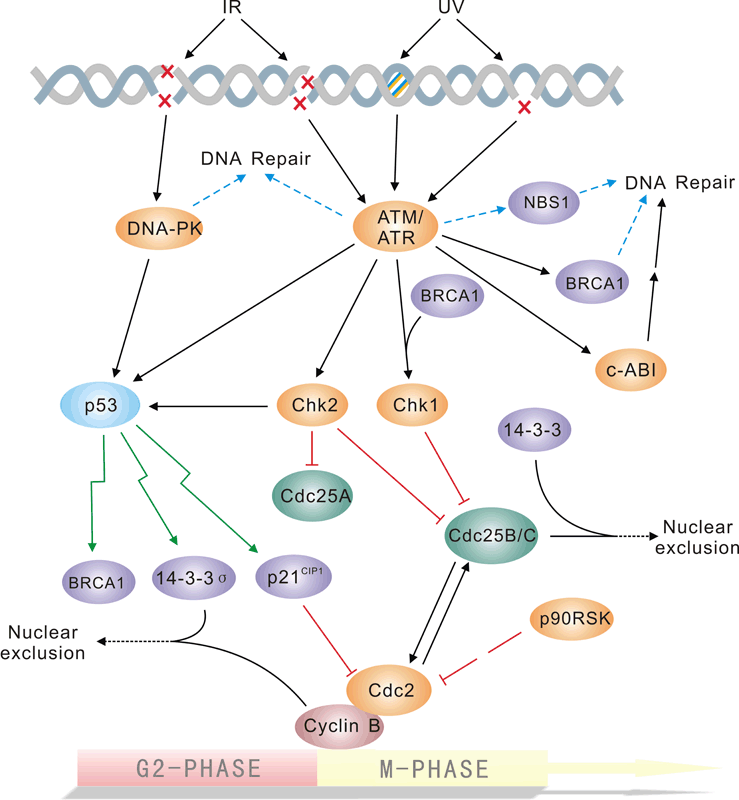 The repair of DNA lesions that occur endogenously or in response to diverse genotoxic stresses is indispensable for genome integrity. DNA lesions activate checkpoint pathways that regulate specific DNA-repair mechanisms in the different phases of the cell cycle. Checkpoint- arrested cells resume cell-cycle progression once damage has been repaired, whereas cells with unrepairable DNA lesions undergo permanent cell-cycle arrest or apoptosis. The G2/M DNA damage checkpoint prevents the cell from entering mitosis (M phase) if the genome is damaged. Environmental DNA-damaging agents include UV light and ionizing radiation. Many of the checkpoint proteins are activated in response to DNA damaged, and a number of phosphorylation events in DNA repair mechanism depend on activation of these kinases. The Mec1/Rad3/ATM/ATR family act early in the checkpoint pathways either as DNA damage detectors or in close association with such detectors. The tumor suppressor P53 is central to the higher eukaryotic checkpoint controls in DNA damage-induced G1 arrest through transcriptional induction of the cyclin-dependent kinases Chk1 and Chk2, and inhibitor p21.Activation of p53 in response to DNA damage and other stresses involves complex posttranslational modification of p53 and its negative modulater MDM2,which is itself induced by p53 at the transcriptional level.