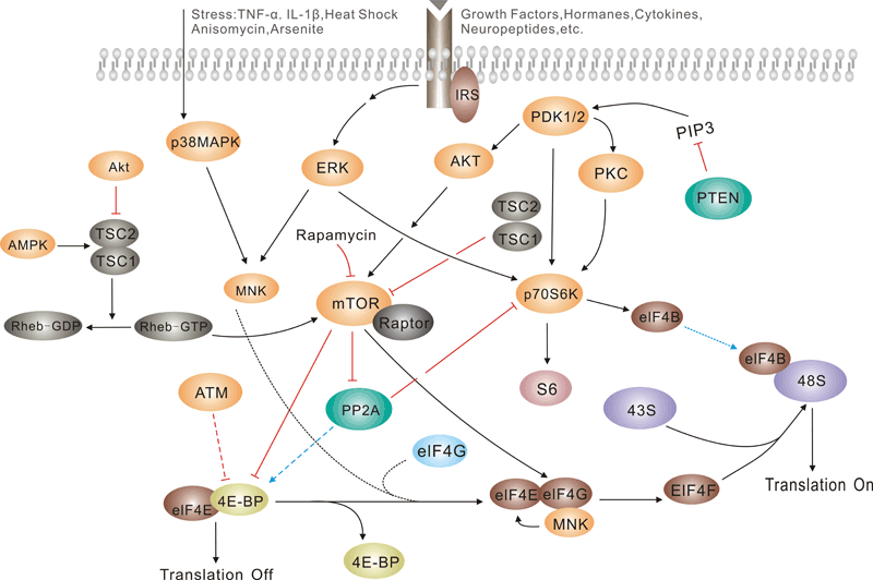 mTOR 通路受多种细胞信号的调控,包括有丝分裂生长因子、胰岛素等激素、营养素(氨基酸、葡萄糖)、细胞能量水平和应激条件。PI3K/Akt(v-Akt小鼠胸腺瘤病毒癌基因同源1)信号转导通路是通过mTOR 传递信号的主要通路,在介导细胞存活和增殖中起重要作用。通过 PI3K/Akt 通路的信号是由与细胞膜上的受体结合的生长因子的有丝分裂刺激启动的。这些受体包括IGFR (胰岛素样生长因子受体)、PDGFR (血小板衍生生长因子受体)、EGFR (表皮生长因子受体)和HER 家族。来自激活的受体的信号直接传递到PI3K/Akt 通路,或者,也可以通过由致癌蛋白RAS 激活的生长因子受体激活。RAS 是另一个信号转导的中枢开关,而且已证实是MAPK (丝裂原活化蛋白激酶)信号转导通路的关键激活子。胰岛素也可通过IRS1/2 (胰岛素受体底物-1/2)激活PI3K/Akt 通路。胰岛素结合激活IR (胰岛素受体)酪氨酸激酶,使IRS1 或IRS2 磷酸化。PI3K 通过P85 调节亚基中的SH2 (Src-Homology-2)结构域与磷酸化IR 结合。这种相互作用激活了p110 催化亚基。然后,PI3K 催化膜结合的PIP2 (磷脂酰肌醇(4,5)二磷酸)转化为PIP3 (磷脂酰肌醇(3,4,5)-三磷酸)。PIP3 然后与Akt 的pleckstrin 同源结构域结合,通过二聚化和暴露其催化位点而导致Akt 的激活。