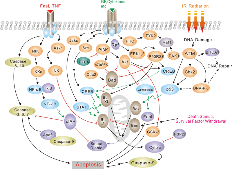 Pro-apoptotic stimuli include the FasL, TNF, DNA damage. Fas and TNFR activate caspases 8 and 10; DNA damage leads to the activation of caspase 9. Anti-apoptotic ligands including growth factors and cytokines activate AKT and p90RSK, which inhibit Bad and prevent cytochrome C release. TNFR can also stimulate an anti-apoptotic pathway by inducing IAP, which directly inhibits caspases 3, 7 and 9.