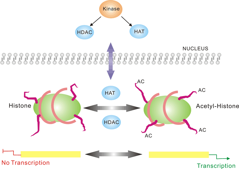 Protein acetylation plays a crucial role in regulating chromatin structure and transcriptional activity. Acetylation complexes or deacetylation complexes can be recruited to DNA-bound transcription factors (TFs) in response to signaling pathways. Histone hyperacetylation by histone acetyltransferases (HATs) is associated with transcriptional activation, presumably by remodeling nucleosomal structure into an open conformation more accessible to transcription complexes. Conversely, histone deacetylation by deacetylation complexes (such as HDAC) is associated with transcriptional repression reversing the chromatin remodeling process.Several transcriptional coactivators and corepressors possess intrinsic acetylase or deacetylase enzymatic activities, respectively. Site-specific acetylation of a growing list of non-histone proteins, including p53 and E2F, has been shown to play an important role in transcriptional regulation and cell proliferation.