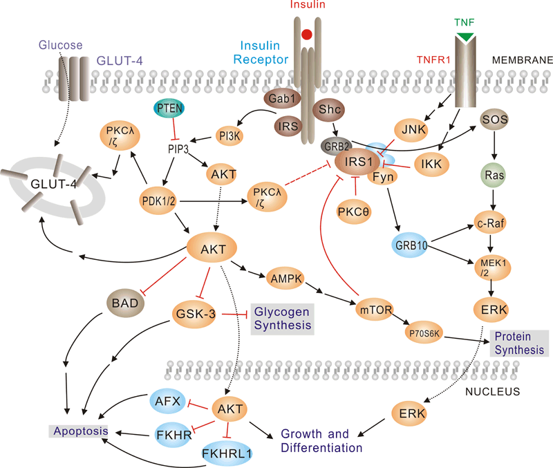 Insulin has diverse effects on cells including stimulation of glucose transport, gene expression and alterations of cell morphology. Insulin signaling begins with either the activation or substrate kinase activity of the insulin receptor (IR), which is the only component of the pathway that is unique to insulin action. The insulin receptor belongs to a subfamily of receptor tyrosine kinases. Activation of the IR can be impaired by post-translational modifications of the protein involving serine phosphorylation, or by binding to inhibiting proteins such as PC-1 or members of the SOCS or Grb protein families. Insulin elicits a diverse array of biological responses by binding to its specific receptor. The hormone mediates these effects by activation of signaling pathways which adaptor molecules such the IRS, the SHC and the GRB2 lipid kinases such as PI3K serine, threonine and tyrosine.