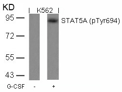 免疫原描述Peptide sequence around phosphorylation site of tyrosine 694 (D-G-Y(p)-V-K) derived from Human STAT5A.