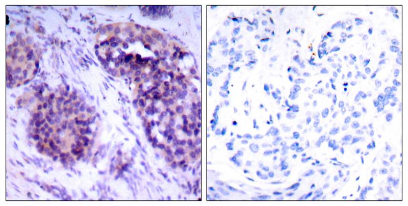 Immunohistochemical analysis of paraffin-embedded human breast carcinoma tissue using BCL-XL (phospho-Ser62) antibody (#11066).