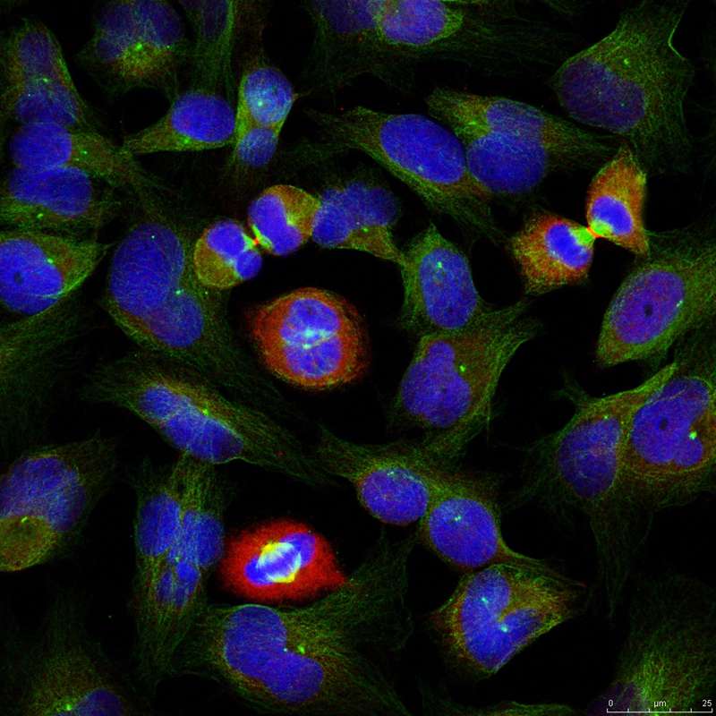 Immunofluorescence staining of methanol-fixed HeLa cells using BCL-XL (phospho-Ser62) antibody (#11066, Red).