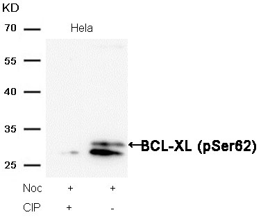 Western blot analysis of extracts from Hela cells, treated with Noc or calf intestinal phosphatase (CIP), using BCL-XL (Phospho-Ser62) Antibody #11066.