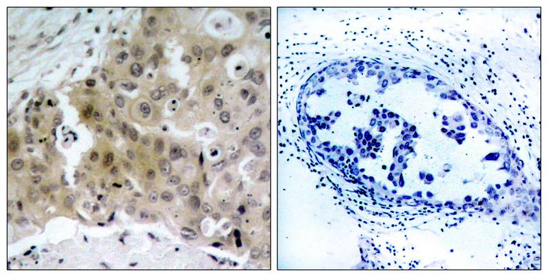 Immunohistochemical analysis of paraffin-embedded human breast carcinoma tissue using VEGFR2(Phospho-Tyr1175) Antibody #11084(left) or the same antibody preincubated with blocking peptide(right).
