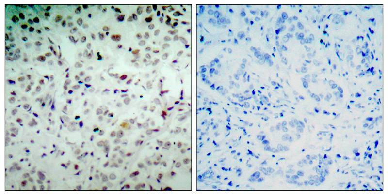 Immunohistochemical analysis of paraffin-embedded human breast carcinoma tissue using Rb(Phospho-Ser780) Antibody #11132(left) or the same antibody preincubated with blocking peptide(right).