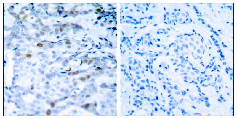 Immunohistochemical analysis of paraffin-embedded human breast carcinoma tissue using CDC2(Phospho-Thr161) Antibody #11134(left) or the same antibody preincubated with blocking peptide(right).