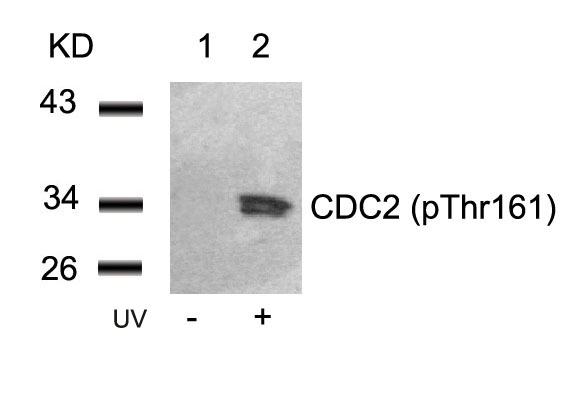 Western blot analysis of extracts from Hela cells untreated(lane 1) or treated with UV(lane 2) using CDC2(Phospho-Thr161) Antibody #11134.