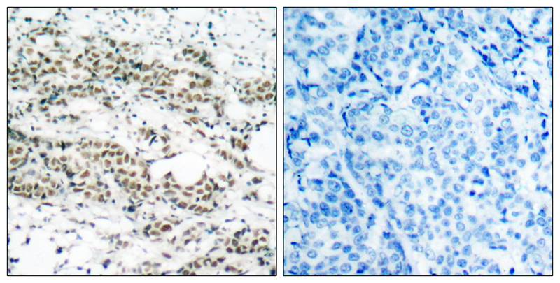 Immunohistochemical analysis of paraffin-embedded human breast carcinoma tissue using AFX(Phospho-Ser197) Antibody #11137(left) or the same antibody preincubated with blocking peptide(right).